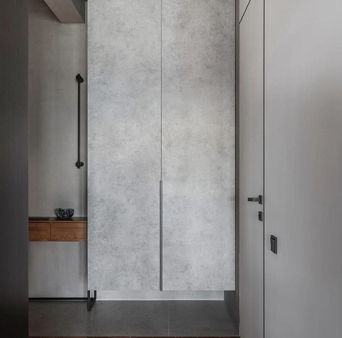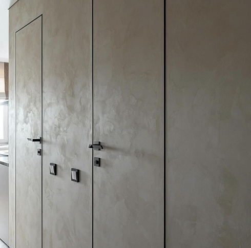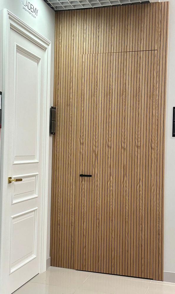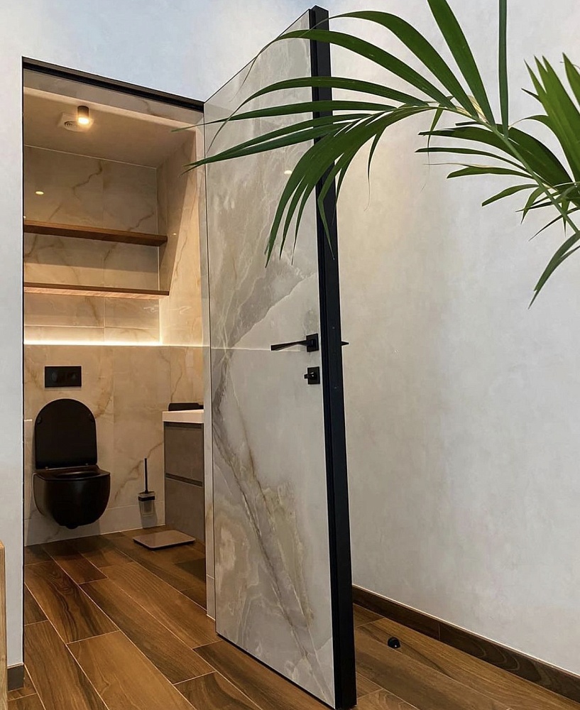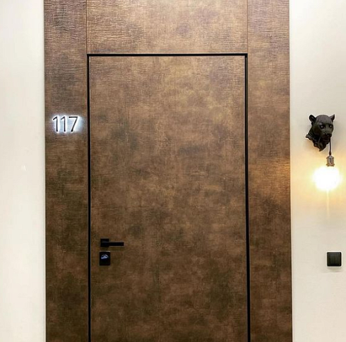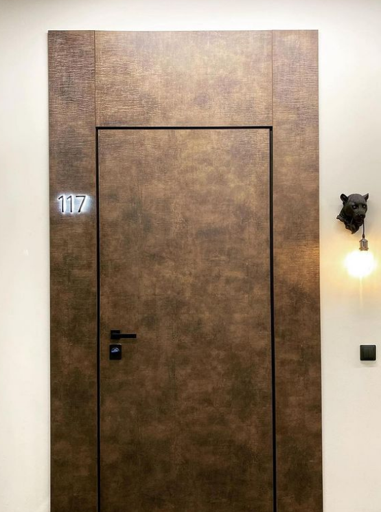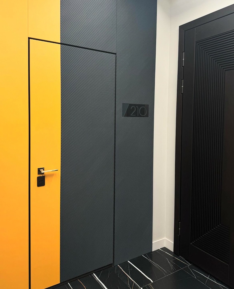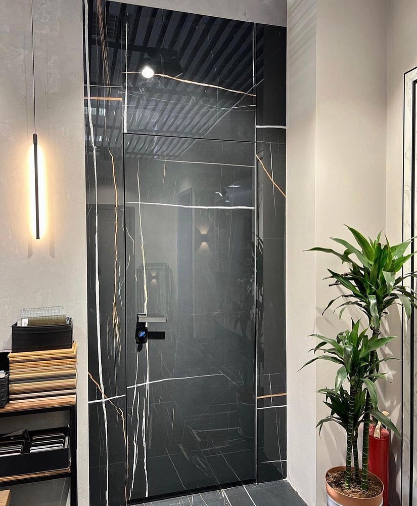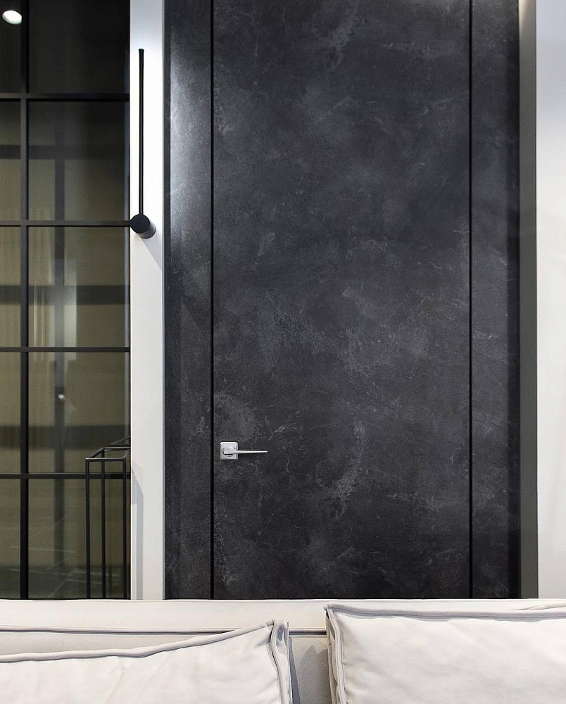 Современно и эстетично. Добавить графичности или сделать акцент именно на скрытой двери помогут современные отделки, например, шпонированные панели или оформление антивандальным материалом с имитацией природного камня. Бонус - возможность изменения облика в соответствии с новыми требованиями интерьера.
