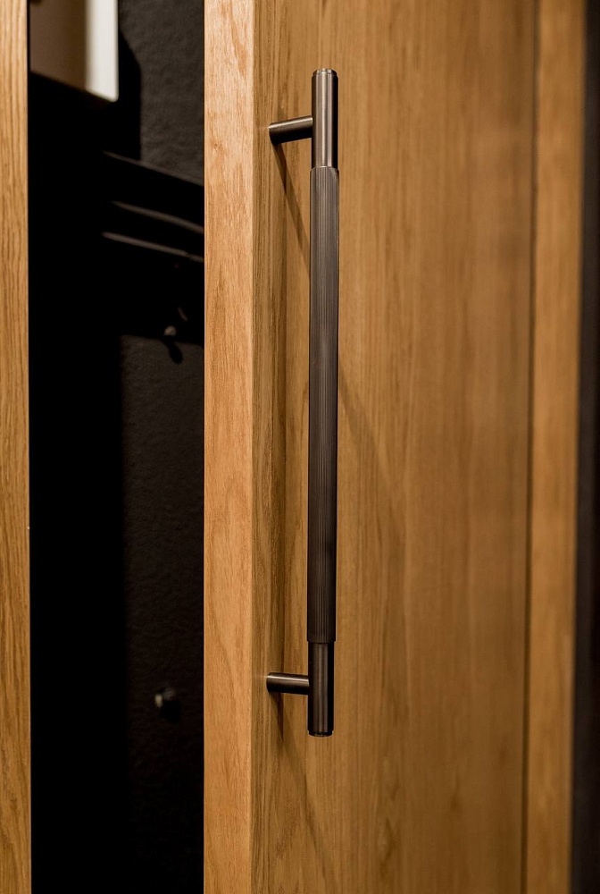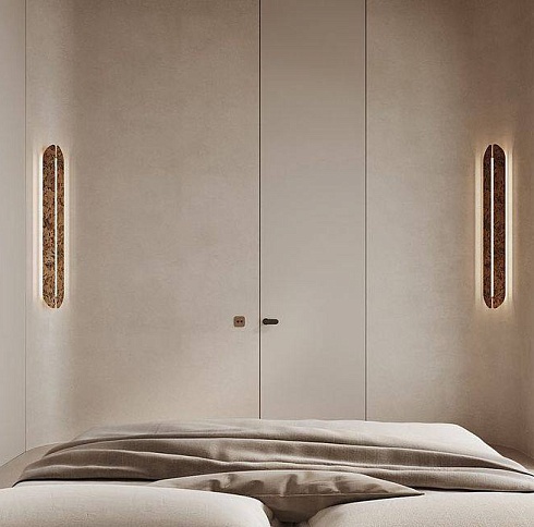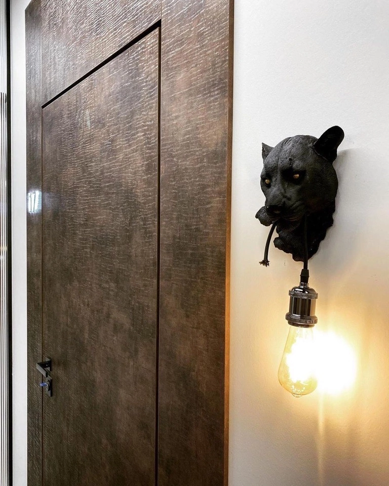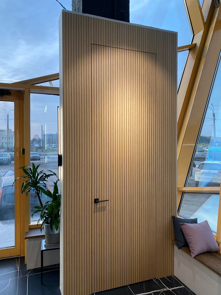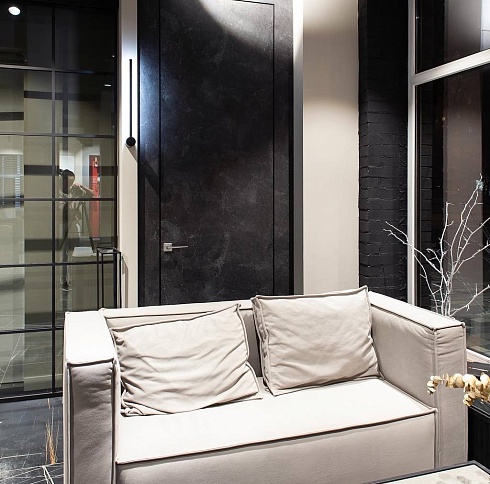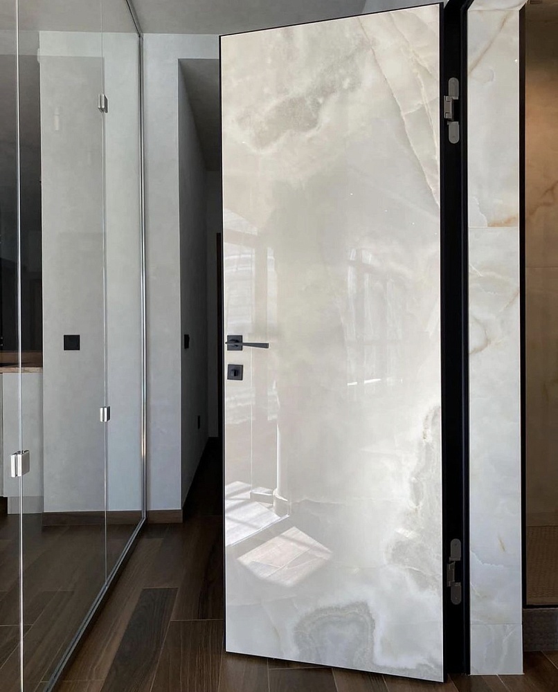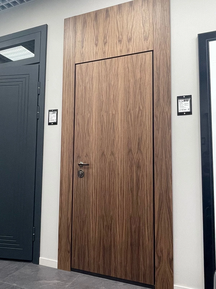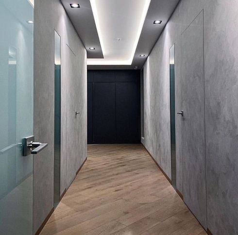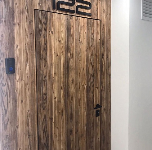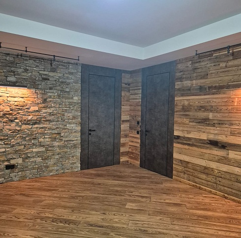 Современно и эстетично. Добавить графичности или сделать акцент именно на скрытой двери помогут современные отделки, например, шпонированные панели или оформление антивандальным материалом с имитацией природного камня. Бонус - возможность изменения облика в соответствии с новыми требованиями интерьера.