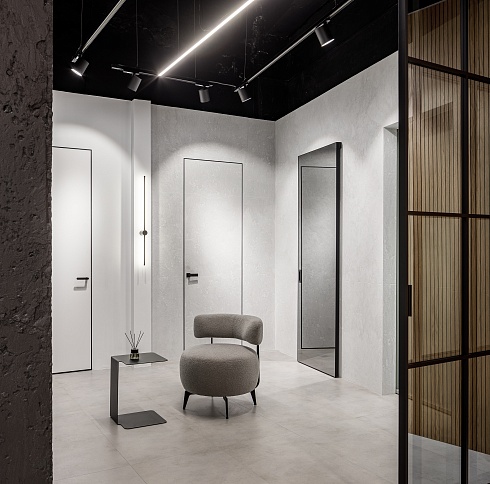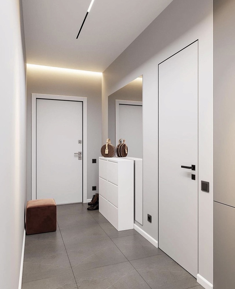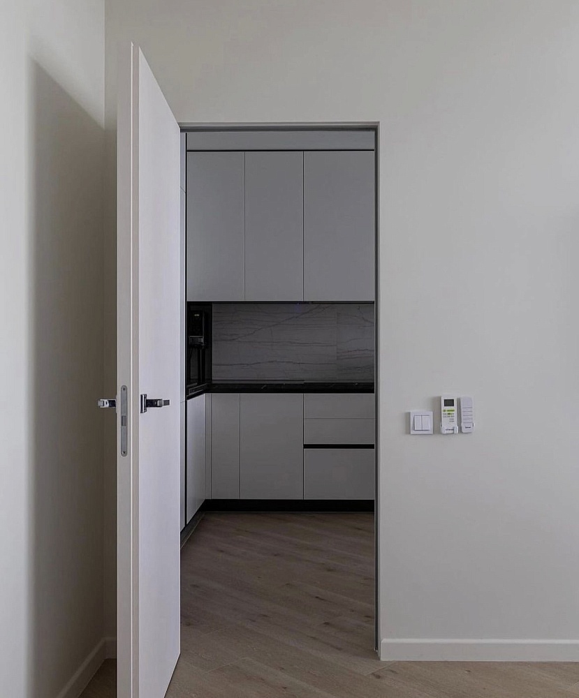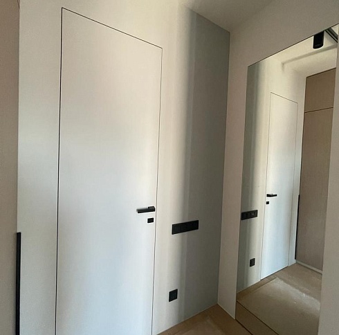 Дверь, которая растворится в дизайнерском пространстве. Универсальное решение - гладкое полотно со срытым коробом, обработанное белым грунтом.
