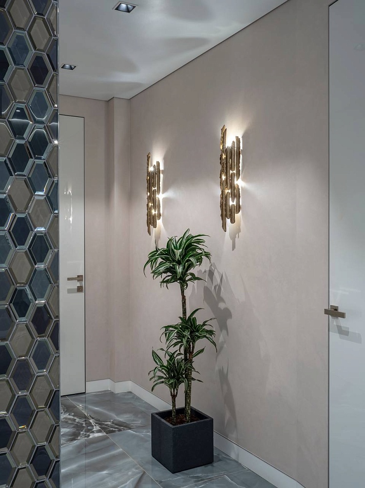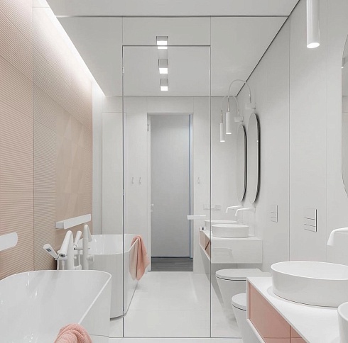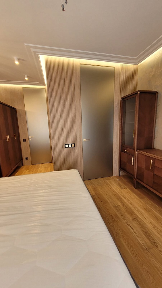 Лёгкость и изящество в каждой детали. Скрытые двери со стеклом разгружают интерьер, способствуют