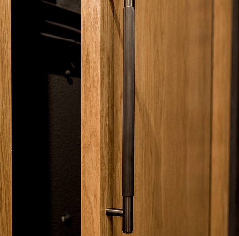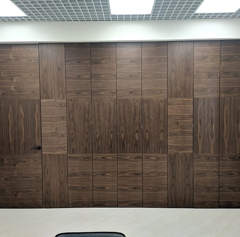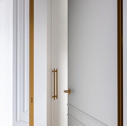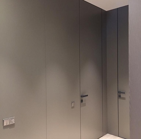 Двери комплектуются скрытыми, регулируемыми в трех плоскостях и с открыванием до 180°(зависит от способа монтажа) петлями и бесшумными магнитными замками с пластиковым язычком итальянского производства. Доступны к заказу раздвижные двери и стеновые панели в цвет дверей.