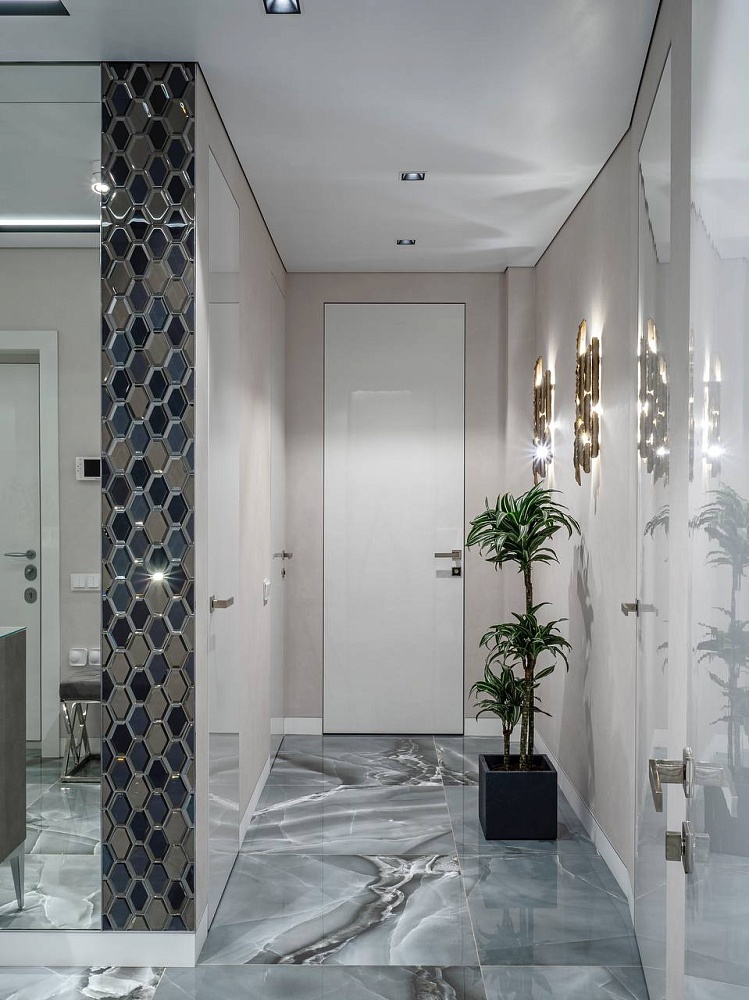 В производстве дверных полотен распространены стеклянные, пластиковые и металлические материалы. Использование зеркал и отражающих поверхностей рассеивает свет, что позволяет визуально увеличивать площадь квартиры.